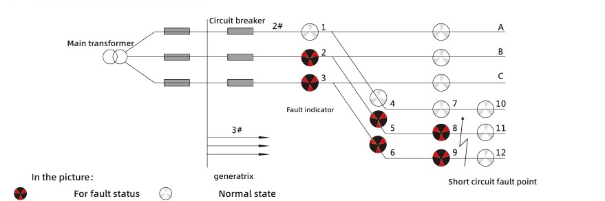 Zirkuitu-laburren fenomenoen ezaugarrietan oinarrituta, babes-gailuaren potentzia-hutsarekin batera zirkuitu labur batean korronte-aldaketa bat-bateko aldaketa erabiltzen da ekintza-irizpide gisa. Matxurak adierazteko diagramaren interpretazio-metodoa honakoa da: 2. lineako A faseko 2., 5. eta 8. argi adierazleak ez direnean B faseko argi adierazlerik, C faseko 3., 6. eta 9. argi adierazleak gorri bihurtzen dira, 11. eta 12. argiak zuri geratzen diren bitartean, irteerako lineako puntu horretan zirkuitu laburren akatsa gertatu dela zehaztu daiteke.